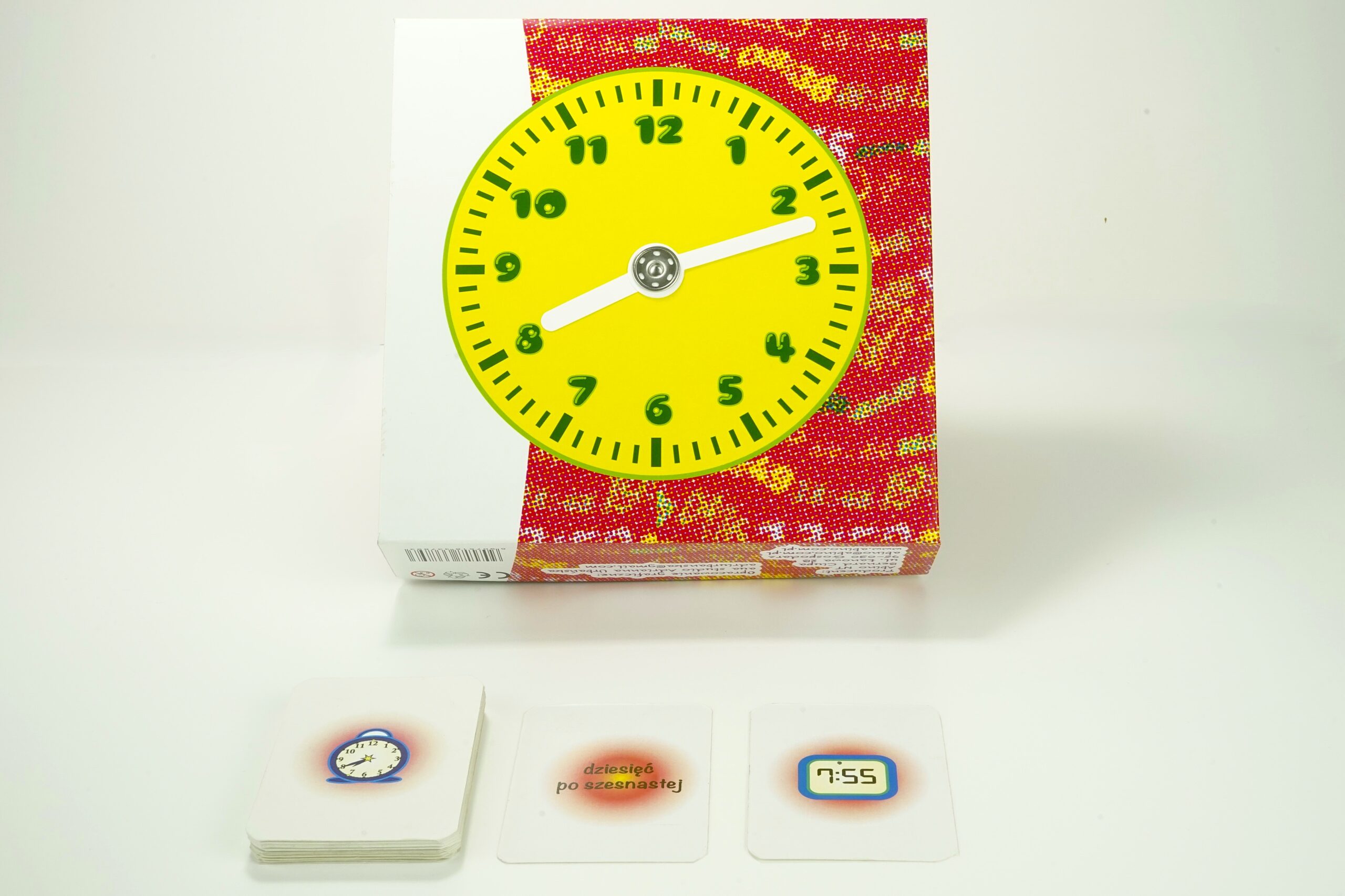Zestaw zawiera plastikowe wskazówki, które można przymocować do pudełka, aby stworzyć własny zegar do ćwiczeń. Dzięki niemu łatwo nauczysz się ustawiać i odczytywać czas.